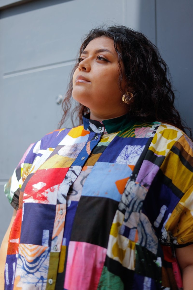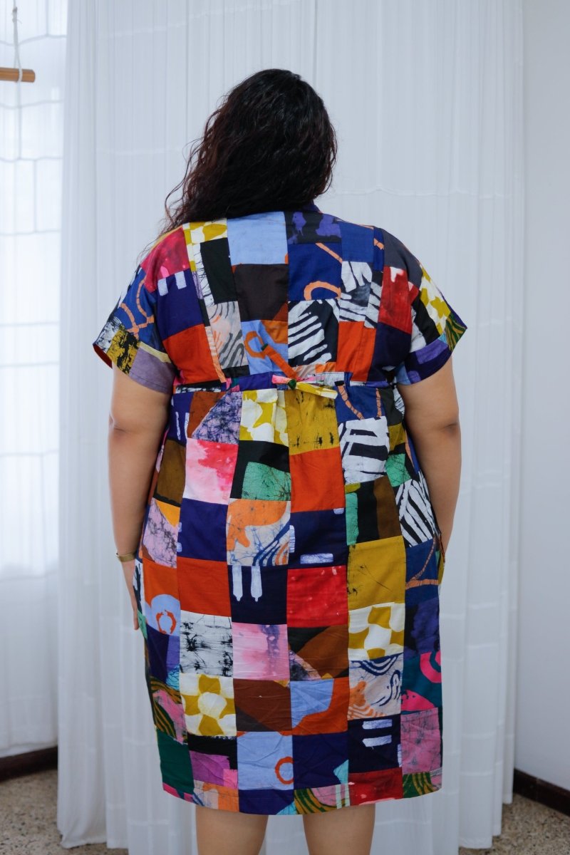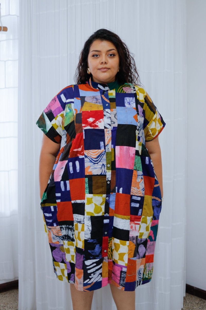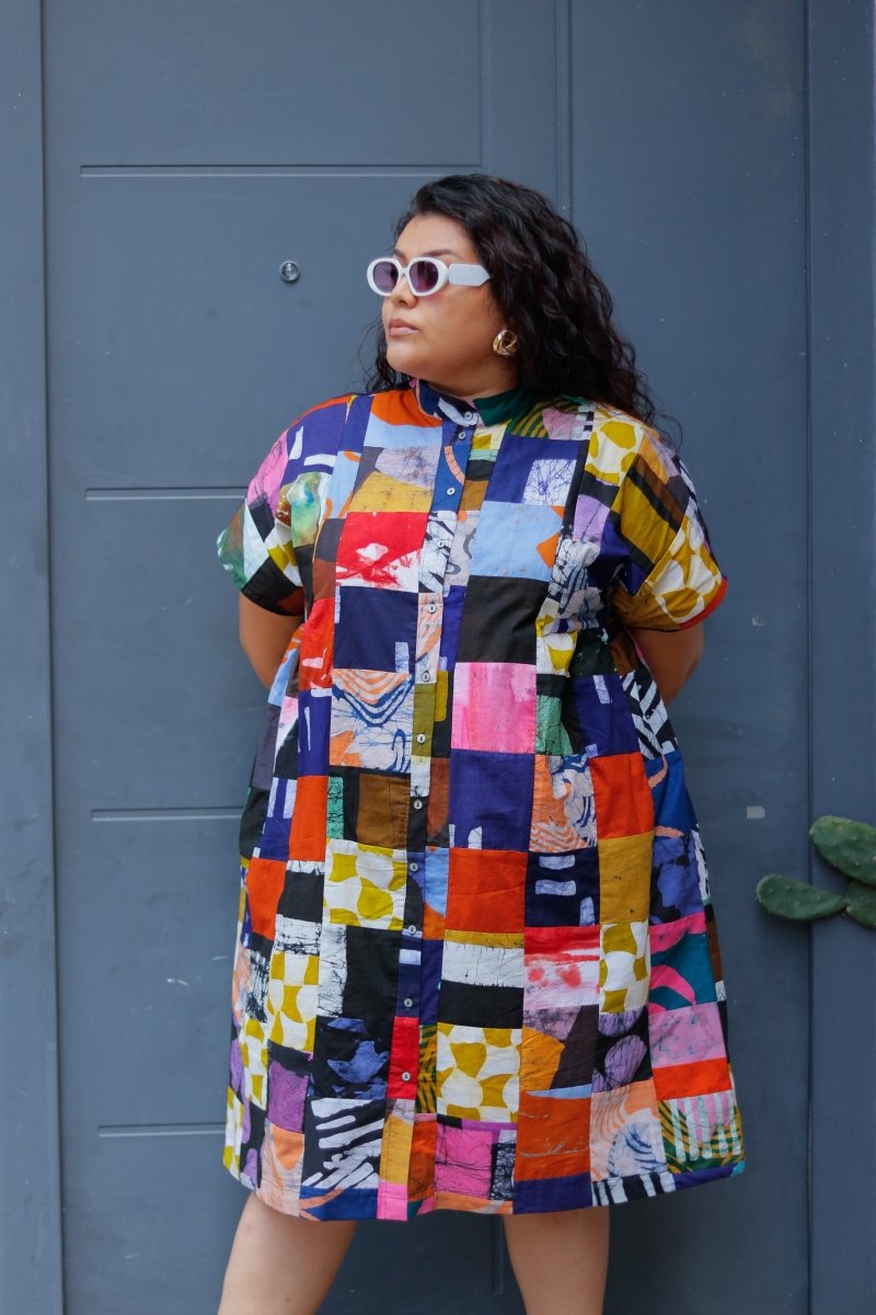 Introducing a very special limited run of our popular loose fitting Bata dress. These dresses are made using patchworked offcuts from recent productions. You might spot your favorite print in the mix! This is a new type of textile for us and we're excited for both the look and feel, and also the waste diversion it makes possible. Viva scraps!